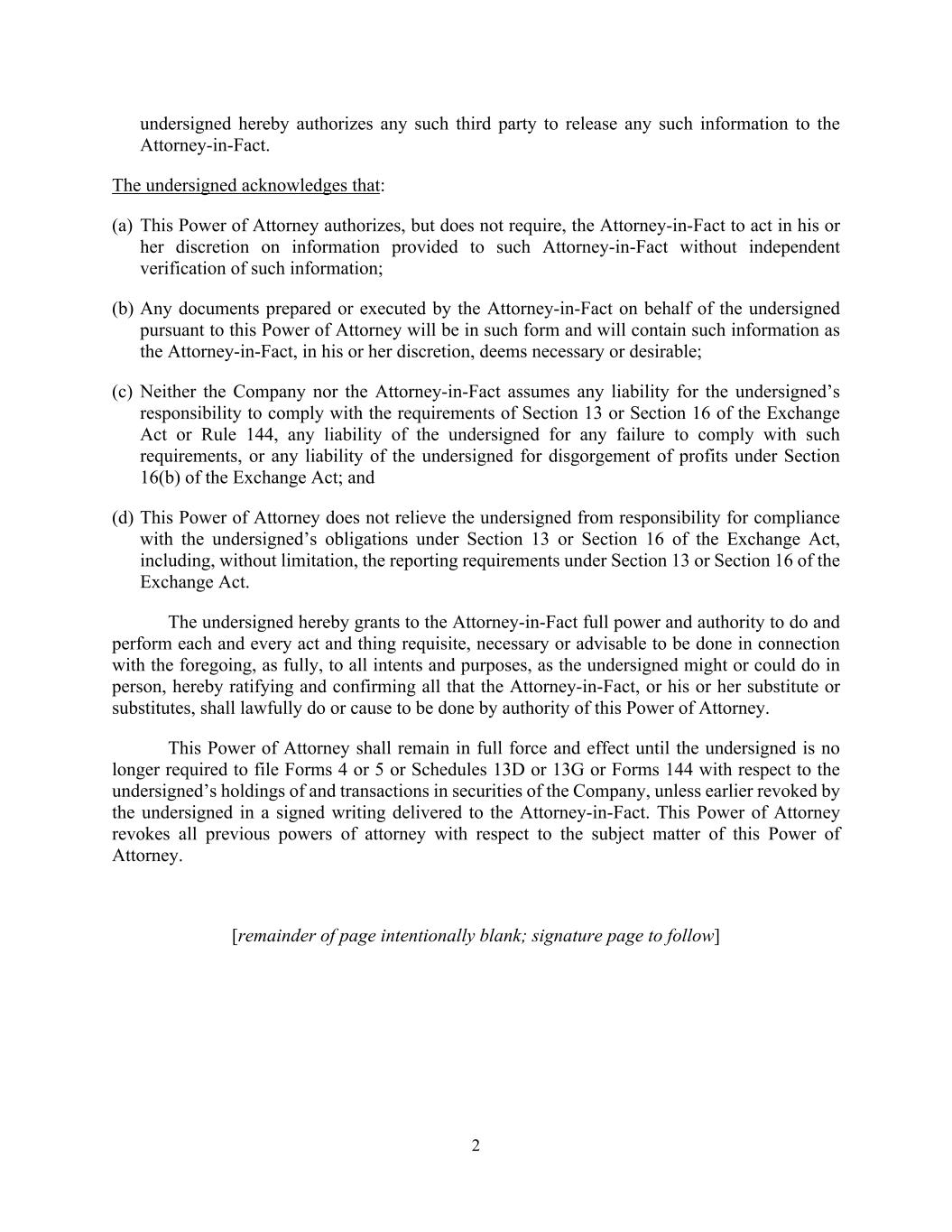 2 undersigned hereby authorizes any such third party to release any such information to the Attorney-in-Fact. The undersigned acknowledges that: (a) This Power of Attorney authorizes, but does not require, the Attorney-in-Fact to act in his or her discretion on information provided to such Attorney-in-Fact without independent verification of such information; (b) Any documents prepared or executed by the Attorney-in-Fact on behalf of the undersigned pursuant to this Power of Attorney will be in such form and will contain such information as the Attorney-in-Fact, in his or her discretion, deems necessary or desirable; (c) Neither the Company nor the Attorney-in-Fact assumes any liability for the undersigned’s responsibility to comply with the requirements of Section 13 or Section 16 of the Exchange Act or Rule 144, any liability of the undersigned for any failure to comply with such requirements, or any liability of the undersigned for disgorgement of profits under Section 16(b) of the Exchange Act; and (d) This Power of Attorney does not relieve the undersigned from responsibility for compliance with the undersigned’s obligations under Section 13 or Section 16 of the Exchange Act, including, without limitation, the reporting requirements under Section 13 or Section 16 of the Exchange Act. The undersigned hereby grants to the Attorney-in-Fact full power and authority to do and perform each and every act and thing requisite, necessary or advisable to be done in connection with the foregoing, as fully, to all intents and purposes, as the undersigned might or could do in person, hereby ratifying and confirming all that the Attorney-in-Fact, or his or her substitute or substitutes, shall lawfully do or cause to be done by authority of this Power of Attorney. This Power of Attorney shall remain in full force and effect until the undersigned is no longer required to file Forms 4 or 5 or Schedules 13D or 13G or Forms 144 with respect to the undersigned’s holdings of and transactions in securities of the Company, unless earlier revoked by the undersigned in a signed writing delivered to the Attorney-in-Fact. This Power of Attorney revokes all previous powers of attorney with respect to the subject matter of this Power of Attorney. [remainder of page intentionally blank; signature page to follow]