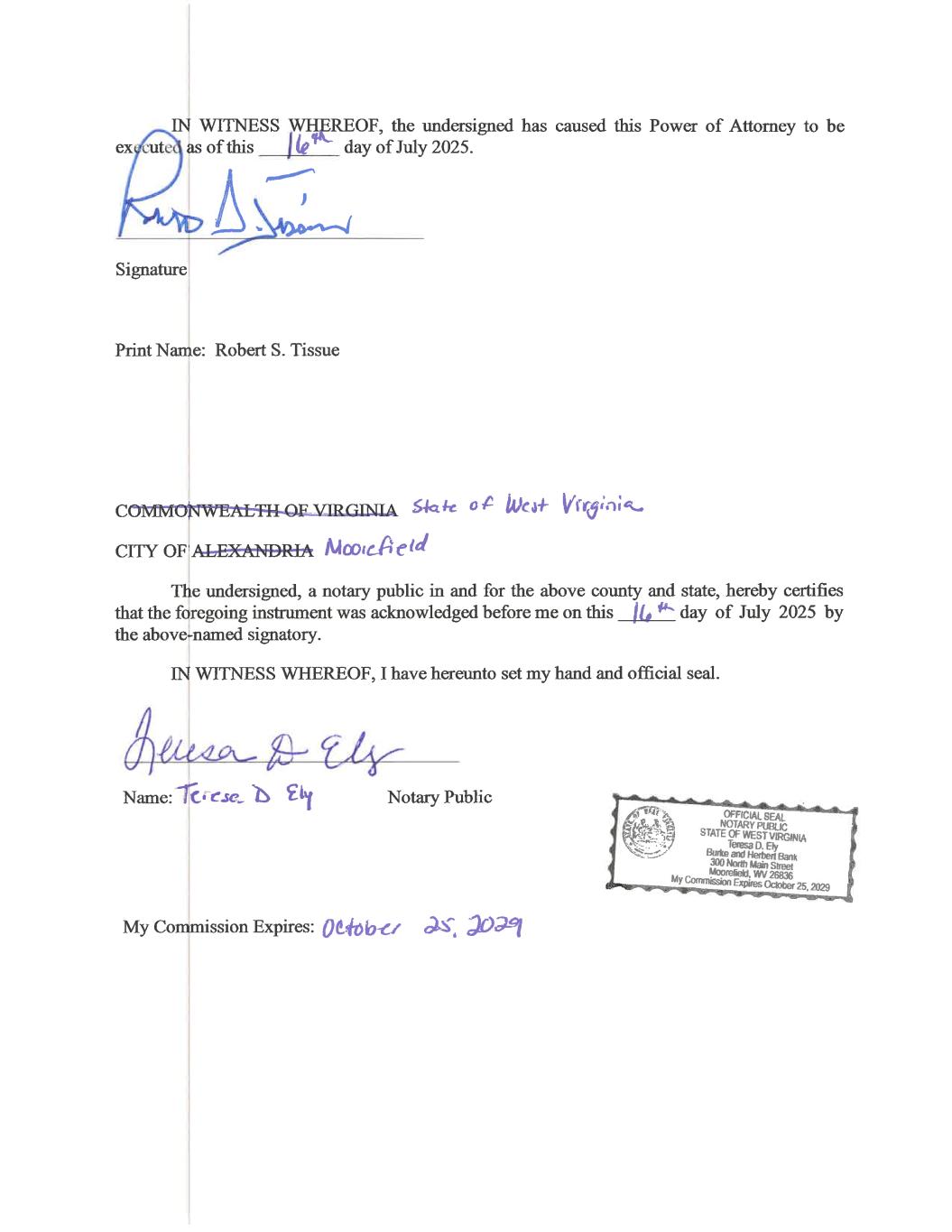 1 EDGAR NEXT & SECTION 16 REPORTING – POWER OF ATTORNEY Know all by these presents, that I do here appoint each of Roy E. Halyama, Matthew W. Rucker, Patrick “Kip” Huffman, Kirtan Parikh, and Zayne R. Tweed, each acting singly, and with full power of substitution, re-substitution, and delegation, the undersigned’s true and lawful attorney-in-fact (each of such persons and their substitutes and delegees being referred to herein as the “Attorney-in-Fact”), with full power to act for the undersigned and in the undersigned’s name, place and stead, in the undersigned’s capacity as an officer, director, or stockholder of Burke & Herbert Financial Services Corp. (the “Company”), to: 1. Take such actions as may be necessary or appropriate to enable the undersigned to submit and file forms, schedules and other documents with the U.S. Securities and Exchange Commission (“SEC”) utilizing the SEC’s Electronic Data Gathering and Retrieval (“EDGAR”) system, which actions may include (a) enrolling the undersigned in EDGAR Next and (b) preparing, executing and submitting to the SEC a Form ID, amendments thereto, and such other documents and information as may be necessary or appropriate to obtain codes and passwords enabling the undersigned to make filings and submissions utilizing the EDGAR system; 2. Prepare and execute any and all forms, schedules and other documents (including any amendments thereto) the undersigned is required to file with the SEC, or which the Attorney- in-Fact considers it advisable for the undersigned to file with the SEC, under Section 13 or Section 16 of the Securities Exchange Act of 1934 or any rule or regulation thereunder, or under Rule 144 under the Securities Act of 1933 (“Rule 144”), including Forms 3, 4 and 5, Schedules 13D and 13G, and Forms 144 (all such forms, schedules and other documents being referred to herein as “SEC Filings”); 3. Submit and file SEC Filings with the SEC utilizing the EDGAR system or cause them to be submitted and filed by a person appointed under paragraph 5 below; 4. File, submit or otherwise deliver SEC Filings to any securities exchange on which the Company’s securities may be listed or traded; 5. Act as an account administrator for the undersigned’s EDGAR account, including: (a) appoint, remove and replace account administrators, account users, technical administrators and delegated entities; (b) maintain the security of the undersigned’s EDGAR account, including modification of access codes; (c) maintain, modify and certify the accuracy of information on the undersigned’s EDGAR account dashboard; (d) act as the EDGAR point of contact with respect to the undersigned’s EDGAR account; and (e) any other actions contemplated by Rule 10 of Regulation S-T with respect to account administrators; 6. Cause the Company to accept a delegation of authority from any of the undersigned’s EDGAR account administrators and, pursuant to that delegation, authorize the Company’s EDGAR account administrators to appoint, remove or replace users for the undersigned’s EDGAR account; and 7. Obtain, as the undersigned’s representative and on the undersigned’s behalf, information regarding transactions in the Company’s equity securities from any third party, including the Company and any brokers, dealers, employee benefit plan administrators and trustees, and the