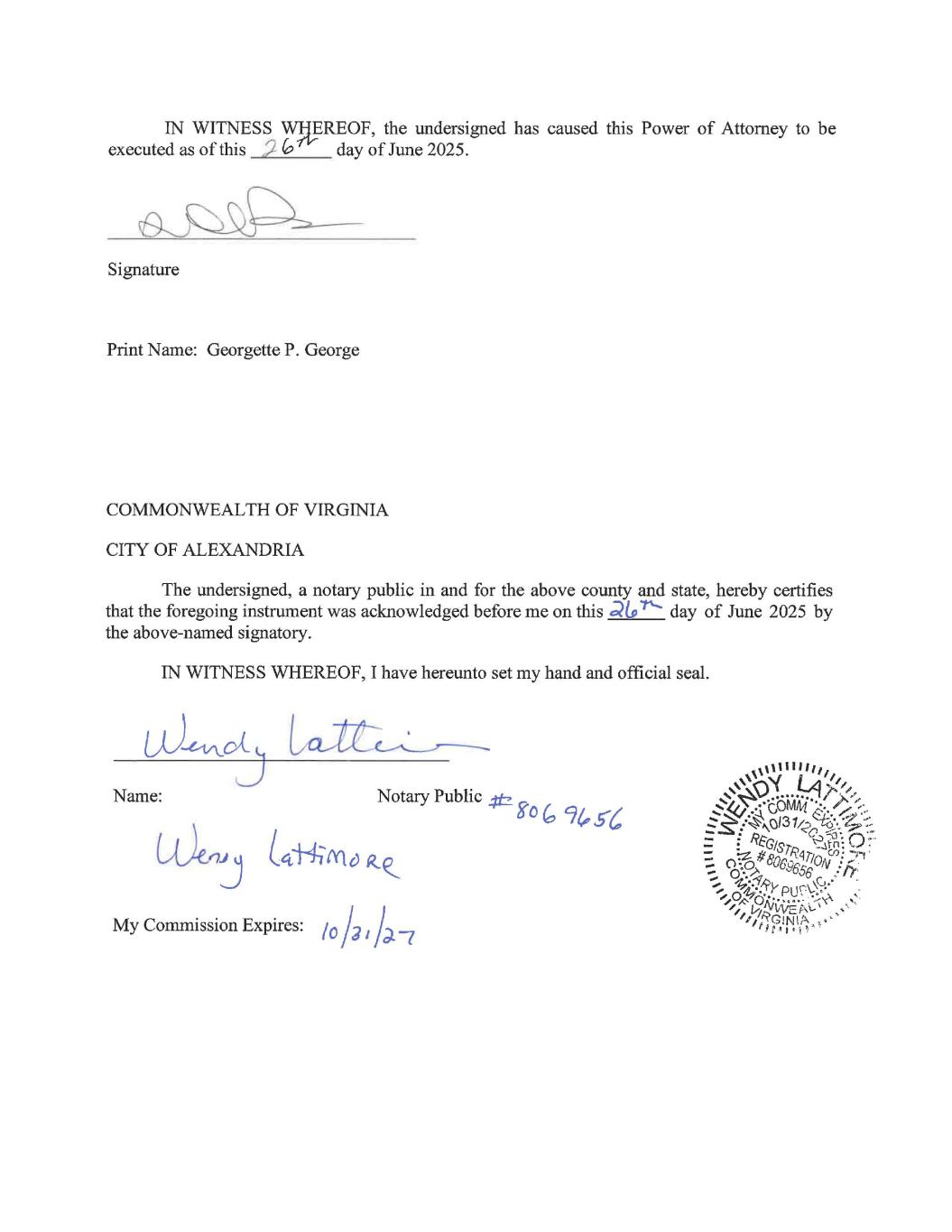 IN WITNESS ~REOF, the undersigned has caused this Power of Attorney to be executed as of this 2 0 day of June 2025. Signature Print Name: Georgette P. George COMMONWEALTH OF VIRGINIA CITY OF ALEXANDRIA The undersigned, a notary public in and for the above county and state, hereby certifies that the foregoing instrument was acknowledged before me on this ~(si 1' day of June 2025 by the above-named signatory. IN WITNESS WHEREOF, I have hereunto set my hand and official seal. Name: Notary Public .:t:b- 0 oO(:, 91.,5{, My Commission Expires: / 0 / d I J;).-,